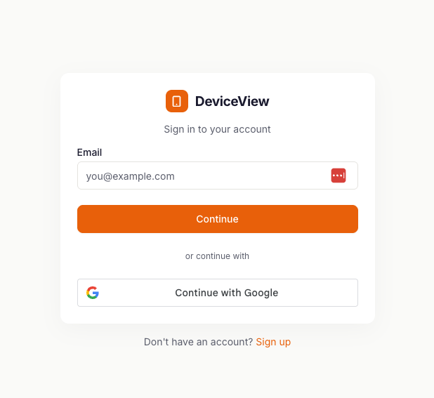 A verification email to the address you signed up with. Once you verify you can login to your DeviceView Portal. If you signed up with a Google email you can use the Google Oauth for quick sign in.